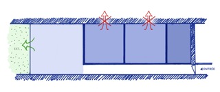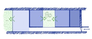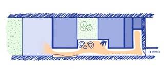L’étroitesse de la parcelle, la mitoyenneté de l’immeuble empêchant la création d’ouvertures latérales mais aussi l’orientation Nord-Ouest du logement et sa situation en rez-de-chaussée conduisent à la création d’une cour intérieure. Autour de celles-ci peuvent s’articuler les chambres.