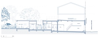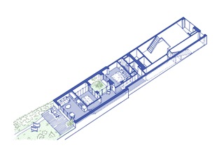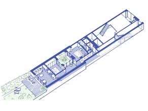 Les niveaux du sol du projet sont au plus proche des altimétries existantes. Ainsi, le logement est séquencé en trois espaces et niveaux différents en rapport avec l’extérieur ; l’entrée, la cour intérieure et le jardin. À chaque emmarchements, l’usager est un peu plus près du niveau du jardin.