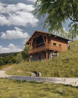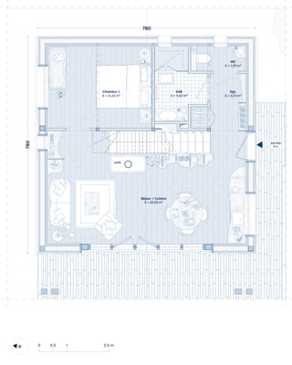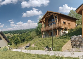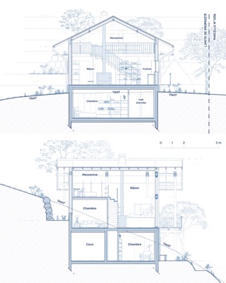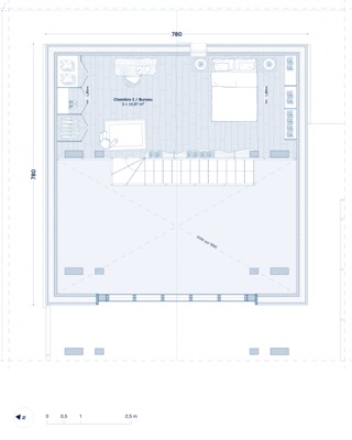 Les espaces à l’arrière du chalet en R+1 et en mezzanine sont destinés aux chambres et aux pièces d’eau.