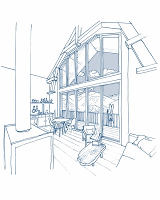 Un escalier mène ensuite à l’espace de vie en R+1, éclairé par une vaste ouverture sur le paysage. La pièce principale de développe en double hauteur. Un poêle à bois occupe une place centrale aussi bien pour ses capacités de chauffage que pour son usage à destination culinaire.