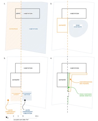 L’objectif est double : optimiser l’espace de rangement de l’entrepôt et redonner un aspect domestique à l’habitation. Par ailleurs, le projet prévoit une uniformisation des façades, un aménagement des extérieurs, une réhabilitation de l’extension du logement et la création de stationnements dédiés à chaque zone.