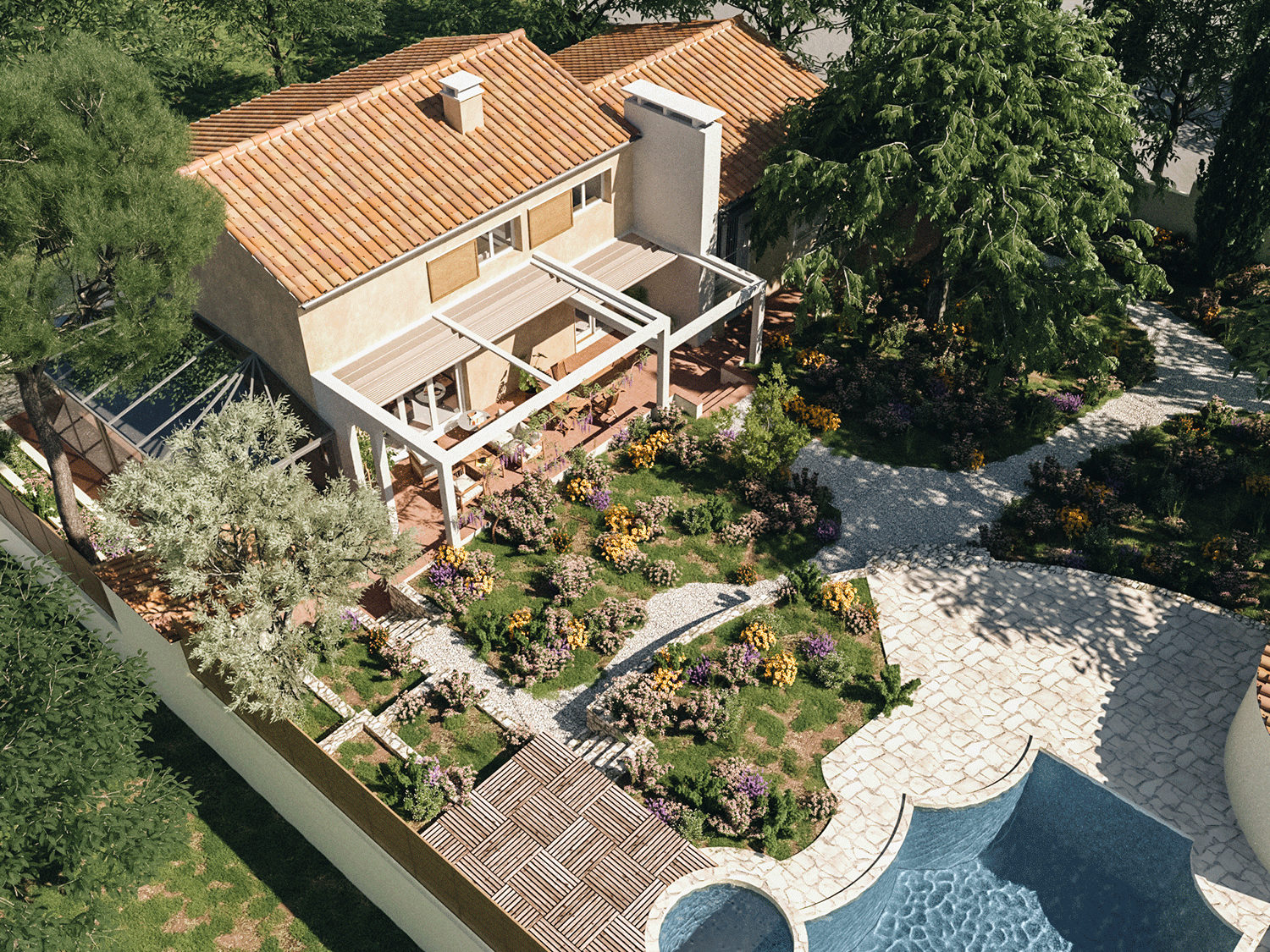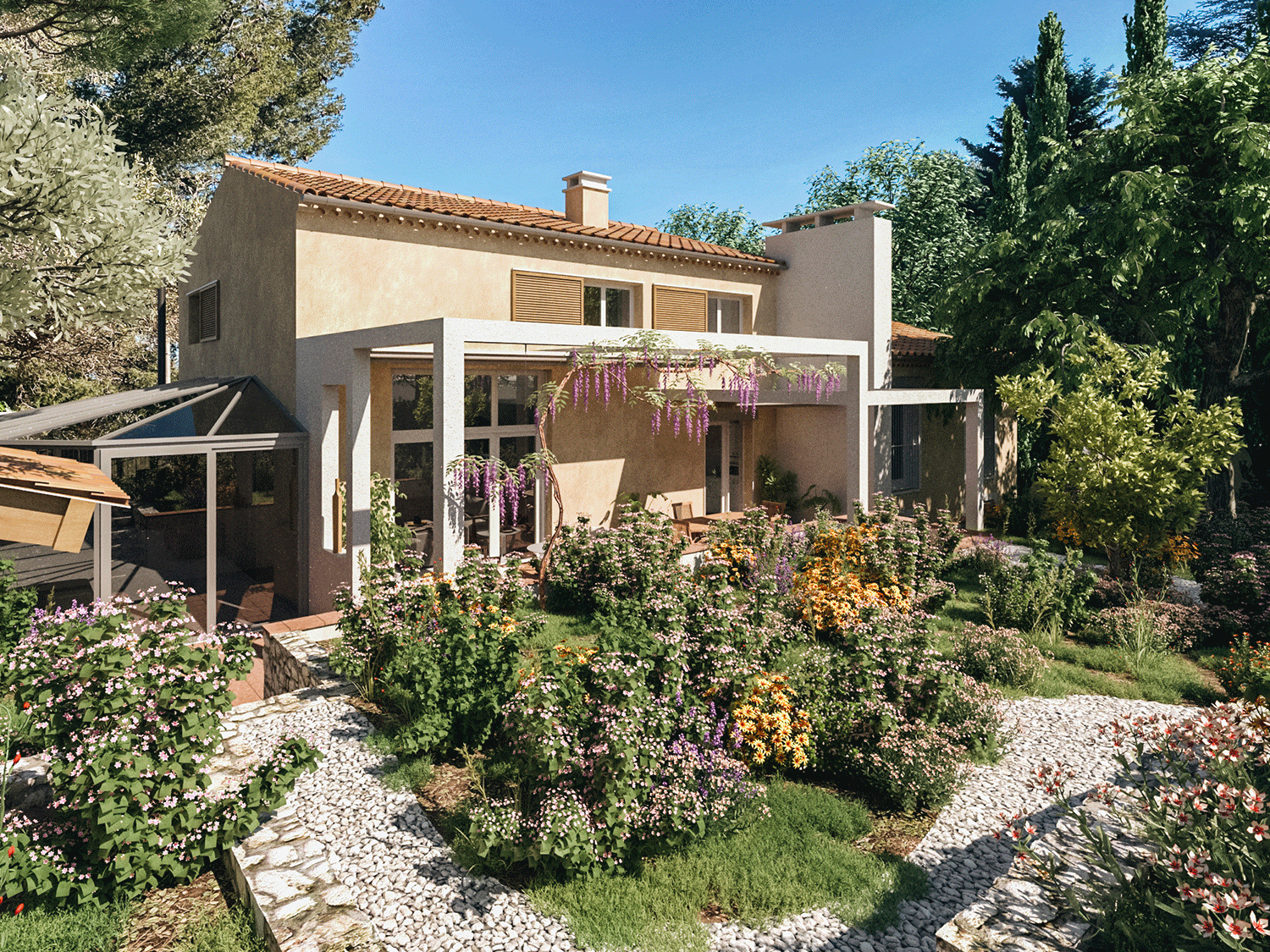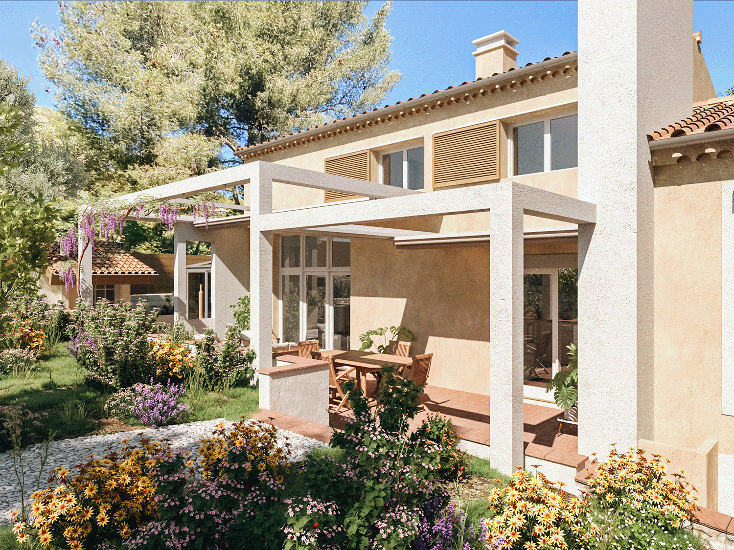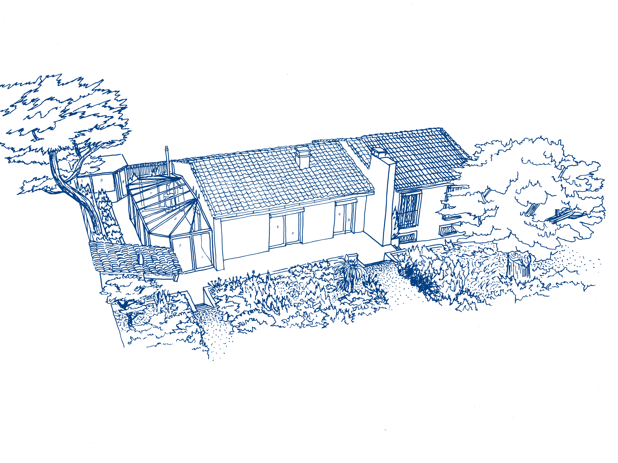 Composé de deux corps de bâtiments attenants, la villa des années 60 de style provençal s’insère dans un écrin végétal abondant dans les quartiers Sud de Marseille. La maison actuelle disposant de différents appentis, véranda et volumétries diverses forme un ensemble complexe au style architectural fourni. Le projet prévoit une surélévation de cette villa pour la création de chambres supplémentaires. L’ajout d’un volume tiers sur l’ensemble de la construction déjà hétéroclite est un réel enjeu en terme d’esthétique notamment. L’objectif a été d’uniformiser le style de la surélévation nouvellement créée avec les corps de bâtiments existants. Le registre provençal typique de la construction d’origine sera alors assumé et prolongé dans l’extension afin de donner l’impression que ce nouveau volume a toujours existé.
